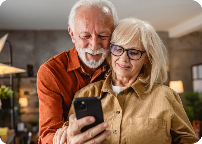 Smiling senior couple outdoors taking selfie, sharing positive experience with Audien hearing aids